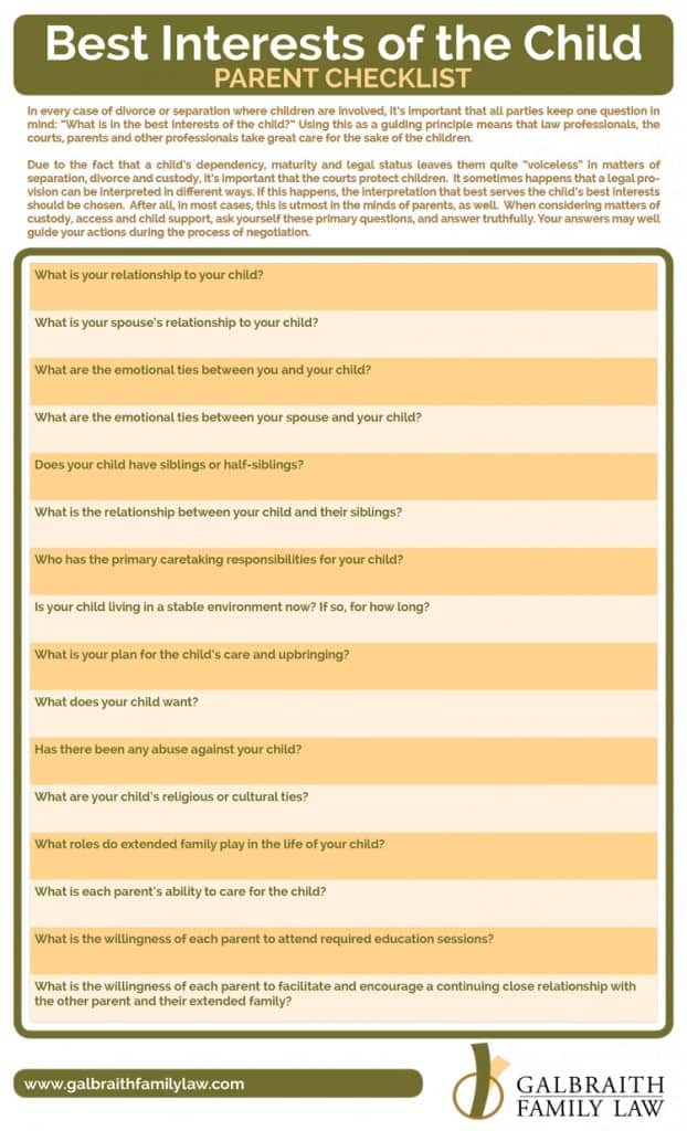 The Best Interests of the Child is a standard that the courts use to determine what’s best for the kids when parents are disputing issues such as custody, access, support, special expenses, etc. Rarely do parents go to court over disputes, but when they do, the judge will look at family relationships, primary caretaking responsibilities, cultural and religious relationships, special needs, and such to make his or her ruling.